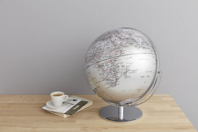 - Attraktives Design: Glänzender Globus JURI (30cm Durchmesser) zweiachsig, mit silbernen Länderflächen und silbernen Meeren in englischer Sprache beschriftet, mit Kontinenten, Ozeanen, Ländern, geographischen Zonen, wichtigen Städten und Gebirgen.