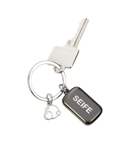 Schlüsselanhänger antibakteriell beschichtet (Seifen-Charm), Seifenstück und Seifenblasen, tötet 99,9% der Oberflächenbakterien ab, Metallguss, glänzend, schwarz/silberfarben/weiß
