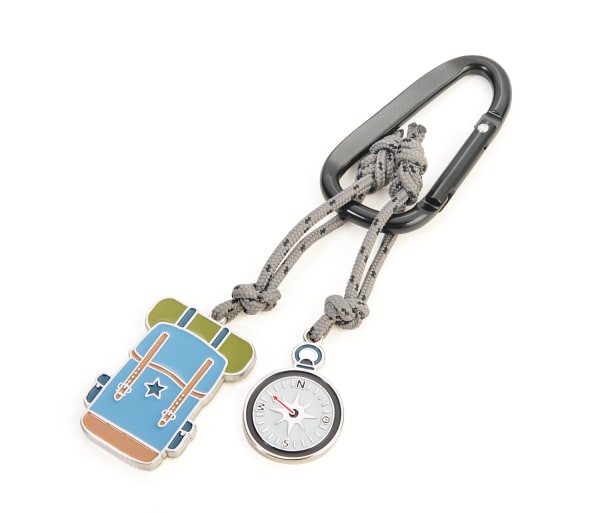 Schlüsselanhänger mit Karabinerhaken, 2 Anhänger an dekorativem Kletterseil: Wanderrucksack und Kompass, Aluminium, Emaille, Metallguss, Nylon, mehrfarbig