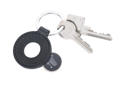 Schlüsselanhänger aus hochwertigem italienischen Echtleder mit Einkaufswagenchip aus Metall, seitliche Öffnung zur Entnahme des Chips, auch für 1€-Münzen geeignet, Prägung: Vorderseite Musterprägung, Rückseite: COIN ADVENTURE, Handarbeit, MADE IN ITALY, Leder, Metall, schwarz