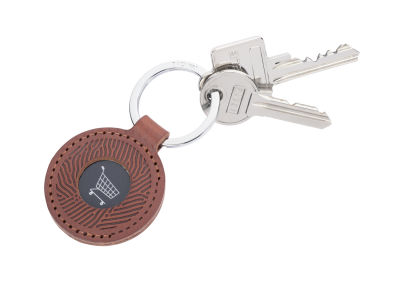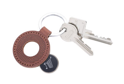 Schlüsselanhänger aus hochwertigem italienischen Echtleder mit Einkaufswagenchip aus Metall, seitliche Öffnung zur Entnahme des Chips, auch für 1€-Münzen geeignet, Prägung: Vorderseite Musterprägung, Rückseite: COIN ADVENTURE, Handarbeit, MADE IN ITALY, Leder, Metall, braun