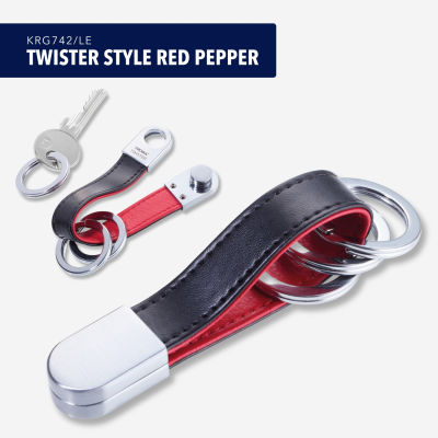Schlüsselanhänger mit abgerundetem "Twist-Verschluss", Lederschlaufe, 3 Schlüsselringe, Kunstleder, Leder, Metall, rot/schwarz