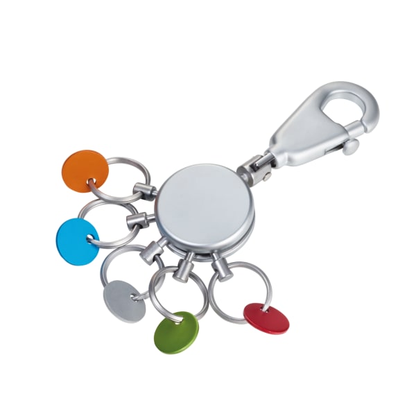 Schlüsselanhänger, rund, inkl. Karabinerhaken, 5 ausklinkbare Ringe, farbige Plättchen zur Schlüsselunterscheidung, Bunte Plättchen zur Unterscheidung der Schlüssel, Messing, Metall, verchromt, glänzend, mehrfarbig
