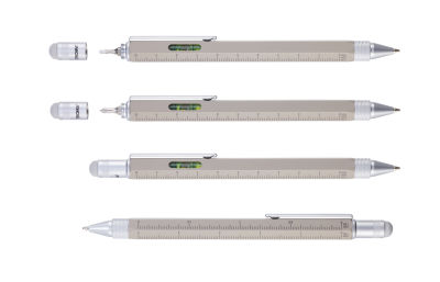 - Kugelschreiber, Planungshilfe und Werkzeugkoffer in einem. Mit Zentimeter- und Zoll-Lineal, 1:20 m und 1:50 m Skala, Wasserwaage, Schlitz- und Kreuzschraubendreher und Stylus
