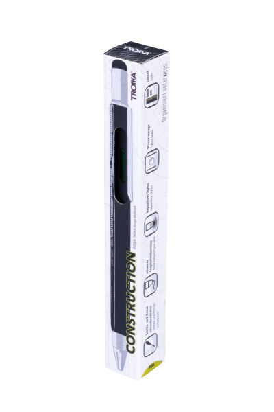Alles läuft nach Plan. Planungshilfe und Werkzeugkoffer in einem! Der Multitasking-Kugelschreiber CONSTRUCTION hat wirklich einiges drauf - und drin. Verschiedene Skalen, Zentimeter- und Zoll-Lineal, Schlitz- /Kreuzschraubendreher, Stylus und Wasserwaage. Da kann nichts mehr schief gehen!