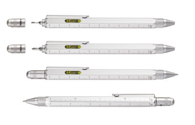 Multitasking-Kugelschreiber, Zentimeter/Zoll-Lineal, 1:20 /1:50 Skala, Wasserwaage, Schlitz-/Kreuzschraubendreher, Stylus, schwarze Mine, Messing, lackiert, silberfarben