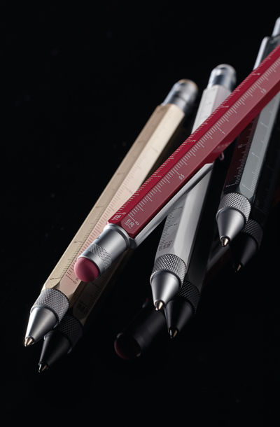 - Kugelschreiber, Planungshilfe und Werkzeugkoffer in einem. Mit Zentimeter- und Zoll-Lineal, 1:20 m und 1:50 m Skala, Wasserwaage, Schlitz- und Kreuzschraubendreher und Stylus.
