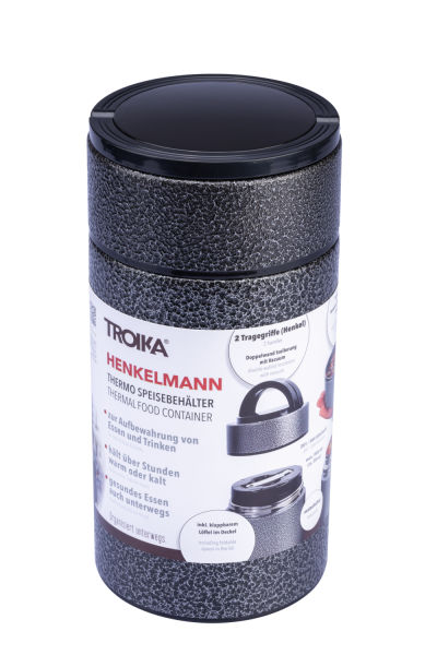 900 ml Inhalt sind ein Wort – der TROIKA HENKELMANN für Mittagspause, Lunch, Snack, Wanderung oder Picknick. Ideal für Suppe oder anderes Selbstgekochtes: Die extra große Öffnung macht das Einfüllen und Entnehmen ganz easy. Und selbst zubereitetes Essen spart Müll und ist praktisch, gesund und nachhaltig. TROIKA HENKELMANN hält dank aufwendiger Doppelwand-Isolierung bis zu acht Stunden warm. Komplett aus Edelstahl in Hammerschlag-Optik, alle Teile lebensmittelecht. Noch mehr Ideen? Der abschraubbare Deckel dient auch als Ess- oder Trinkgefäß und bringt den zusammenklappbaren Edelstahl-Löffel gleich mit.