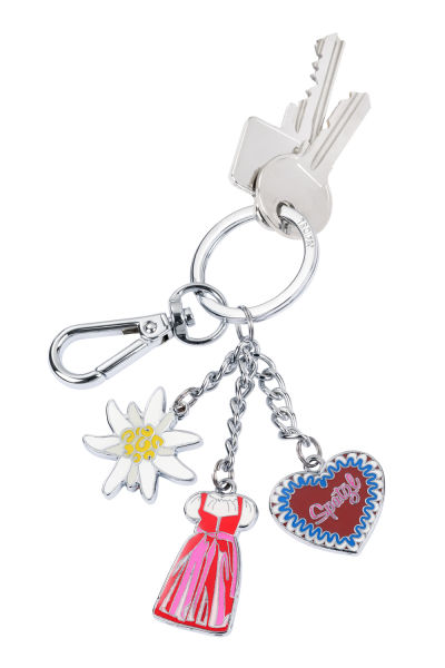 Schlüsselanhänger und Taschenanhänger mit Karabiner, Dirndl, Lebkuchenherz und Edelweiß, "Oktoberfest" Gravur auf der Rückseite, Emaille, Metall, verchromt, glänzend, mehrfarbig/silberfarben
