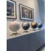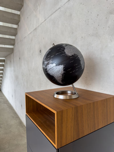 - Matter, zweifarbiger Globus (25 cm Durchmesser) mit einer Neigung von 23,5 Grad, silbernen Länderflächen und schwarzen Meeren, beschriftet in englischer Sprache. Enthält Ozeane, Länder, geographische Zonen und wichtige Städte. Die Gebirge sind auf der Oberfläche fühlbar hervorgehoben.