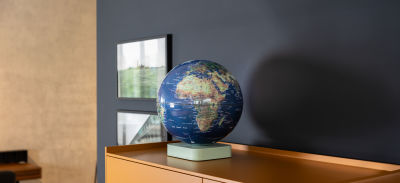 Globus mit 30 cm Durchmesser, topografische Karte, magnetischer, mintfarbener Standfuß aus recyceltem Material, 3D Druck, Kunststoff, glänzend, blau/grün/mintgrün