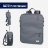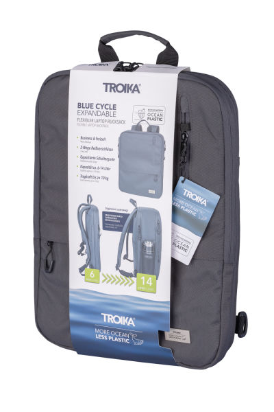 Laptop-Rucksack aus recyceltem Meeresplastik, erweiterbar durch zusätzlichen Reißverschluss, mit 2 großen Fächern (gepolstertes Laptopfach und Hauptfach) mit 2-Wege Reißverschluss, für Laptop (bis zu 16''), mehrere Innentaschen, 2 Frontfächer + expandiert 2 Netztaschen für Flasche und Schirm, verstärkter Standboden, Schlaufe zur Befestigung am Trolley, Tragegriff, versteckte Rucksackgurte, Kapazität von ca. 6 Liter auf ca. 14 Liter erweiterbar, 100% rPET, recyceltes Meeresplastik, dunkelgrau