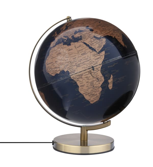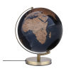 Globus mit 30 cm Durchmesser, integrierte Beleuchtung in 3 Helligkeitsstufen mittels Touch Funktion, inklusive Ladestecker mit GaN - und Schnellladetechnologie Power Delivery, 20W mit USB-C und USB-A Anschluss, antikgoldfarbener, gebürsteter Metallfuß, Kartenrelief, bewegliche Achse, Kunststoff, Metall, matt, bronzefarben/dunkelblau