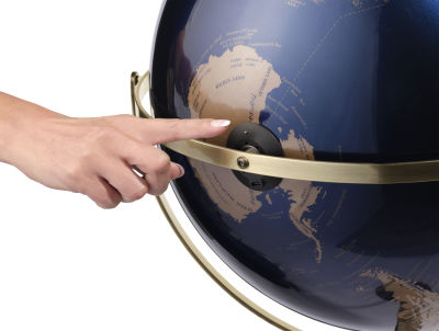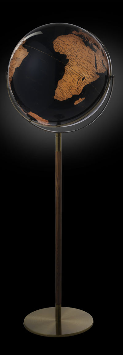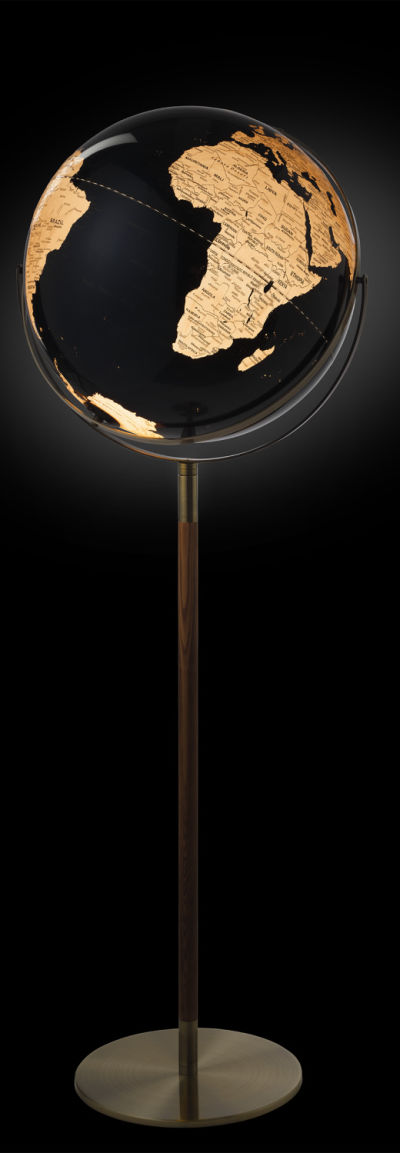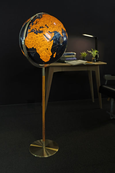 - LED-Globus APOLLO LIGHT FLEX (43 cm Durchmesser). Die Länderflächen sind braun und die Meere sind dunkelblau. Der Globus ist in englischer Sprache beschriftet und zeigt Kontinente, Länder, Ozeane, geografische Zonen, wichtige Städte und Gebirge. Die Gebirge sind auf der Oberfläche fühlbar hervorgehoben.
