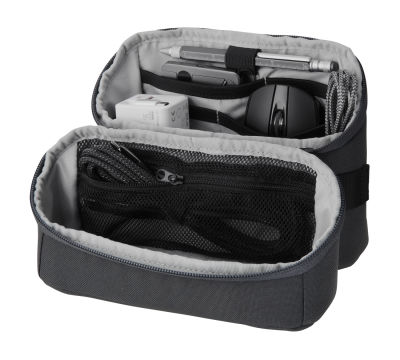 Kabeltasche für Elektronikzubehör, aus recyceltem Meeresplastik, 1 Fach, umklappbar zu 2 Ebenen, mit 2-Wege Reißverschluss, 1 Netzfach mit Reißverschluss, 1 Stiftschlaufe, 6 offene Fächer in verschiedenen Größen für Powerbank, Maus, Speichermedien, Visitenkarten, Ladekabel etc., offene Fronttasche für z.B. das Smartphone, Henkel und Strap zur Befestigung am Trolley, 100% rPET, recyceltes Meeresplastik, dunkelgrau