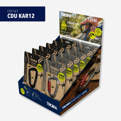 Thekendisplay inkl. 12 x TROIKARABINER Karabiner (KAR12/..), vorsortiert (je 6 x KAR12/BK, KAR12/RD), zur Selbstbedienung, Pappe, bedruckt, matt, mehrfarbig