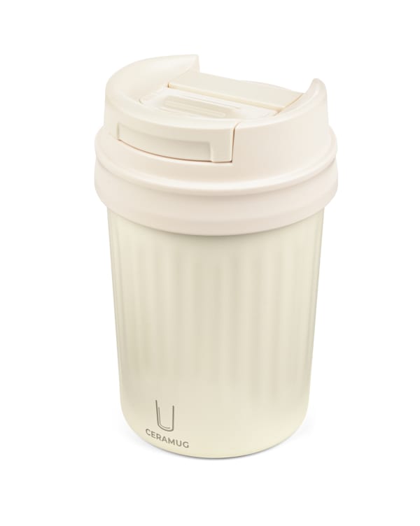 Thermobecher für Kaffee und andere Heißgetränke, Doppelwand-Isolierung mit Vakuum und WEILBURGER® Keramik Beschichtung im Inneren, Fassungsvermögen: 300 ml, auslaufsicherer Kunststoffdeckel durch integrierten Schiebeverschluss, geriffelte Optik, 304 Edelstahl, Kunststoff, Silikon, pulverbeschichtet, matt, weiß