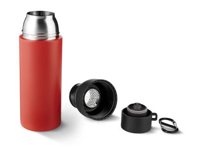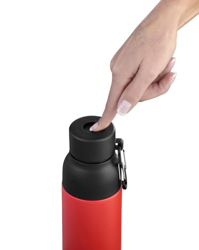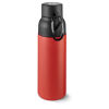 Thermoflasche mit Einhandverschluss, Doppelwand-Isolierung mit Vakuum, 550 ml Fassungsvermögen, lebensmittelecht, große, abschraubbare Öffnung zum Einfüllen von Eiswürfeln etc., mit Doppelkarabiner zur Befestigung an Taschen oder zum Einhängen von Schlüsseln, auslaufsicher, 201 Edelstahl, 304 Edelstahl, Kunststoff, pulverbeschichtet, matt, rot/schwarz