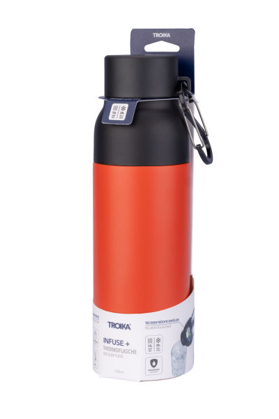 Die INFUSE+ Flasche mit doppelwandiger Vakuum-Isolierung hält Getränke bis zu 12 Stunden heiß oder 24 Stunden kalt – mit 550 ml perfekt für unterwegs, im Büro oder beim Sport. Der Einhandverschluss öffnet per Knopfdruck, das integrierte Sieb filtert Teebeutel, Zitrone oder Minzblätter beim Trinken zuverlässig mit. Dank der weiten Öffnung kannst du ganz einfach Eiswürfel einfüllen. Der rutschfeste Silikonboden sorgt für stabilen Stand, der Doppelkarabiner ermöglicht die Befestigung an Taschen oder Rucksäcken – oder wird kurzerhand zum Schlüsselhalter. Auslaufsicher, robust und in vier Farben erhältlich: Schwarz, Rot, Weiß oder Silber.