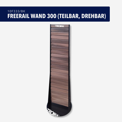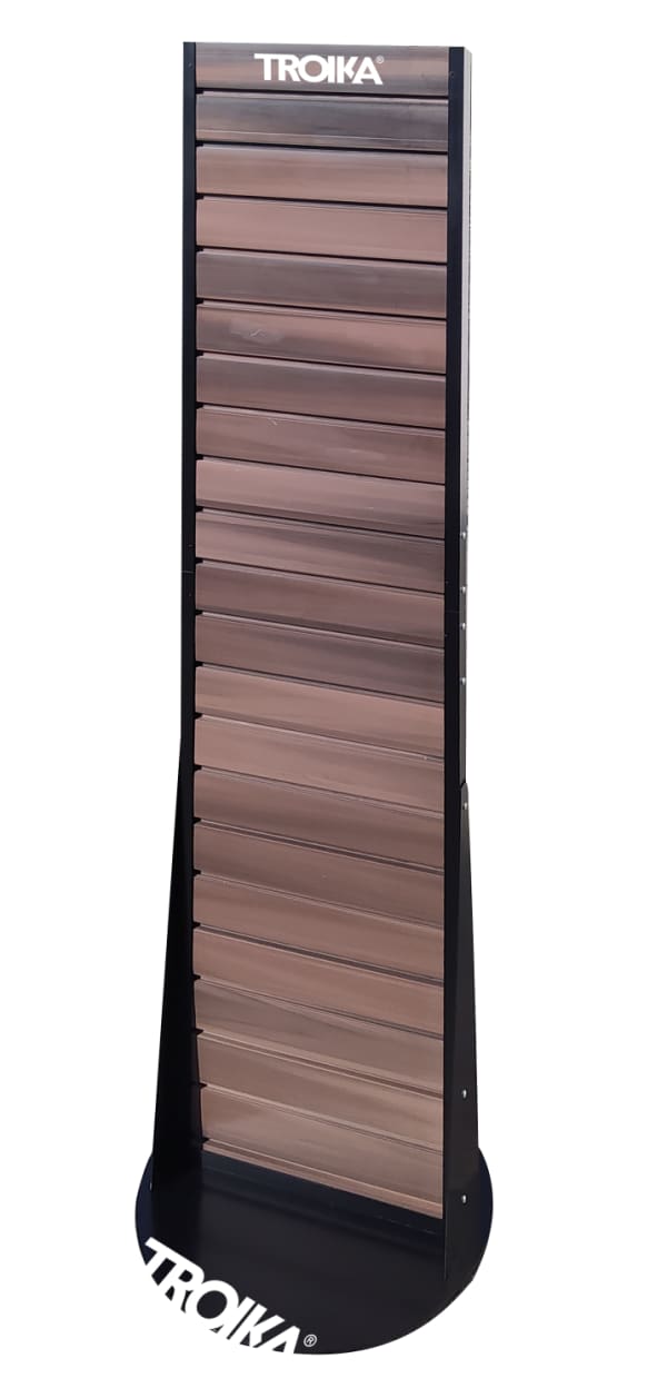 Bodendisplay zur Selbstbedienung, zweiseitige Lamellenwand, Holzoptik, für Eurohaken (10F306, 10F307, 10F308, 10F312, 10F321, 10F322, 10F325), für Regalboden (10F337), für Schütte (10F326, 10F335), Standfuß (rund), drehbar, mit TROIKA-Logo, teilbar, matt, braun/schwarz
