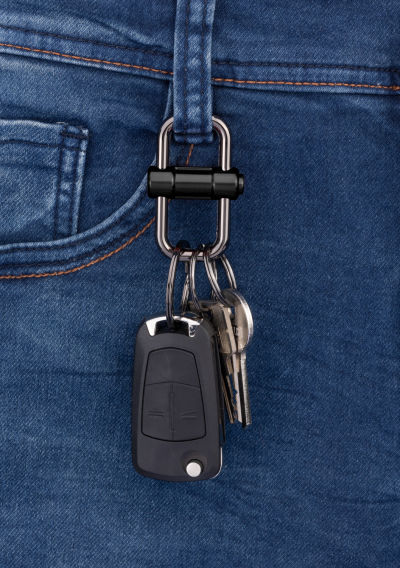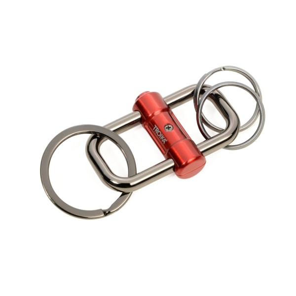 Coole Technik für alle, die öfter mal die Schlüssel wechseln. Einfach per Knopfdruck die Verriegelung lösen, und der Metallbolzen gleitet geschmeidig nach links oder rechts und gibt die Schlüsselringe frei. Aus massivem Metallguss in Gunmetalgrau mit silbernem, schwarzem, grauem, blauem oder rotem Verschluss.