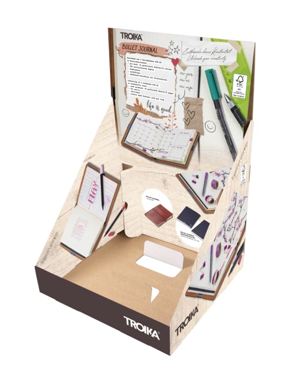 Thekendisplay für 6 x TROIKA BULLET JOURNAL (BTJ36/BR) und 4 x 2er-Set Ersatz-Notizbücher DIN A5 (/BOOK JOURNAL SET BK), zur Selbstbedienung, Pappe, bedruckt, matt, mehrfarbig