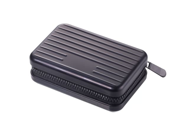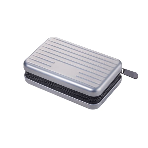 Nur 70 x 105 x 30 mm groß, aber im Design schon ganz erwachsen. Und mit Funktionen, die kaum ein großer Hartschalenkoffer vorzuweisen hat: neun Fächer mit Platz für bis zu 20 Karten, Kleingeld oder Belege, Ausleseschutz für RFID-Chips und dazu ein umlaufender Reißverschluss. Aus Aluminium und Polyester in mattem Schwarz, Blau und Rot sowie Titanfarben.
