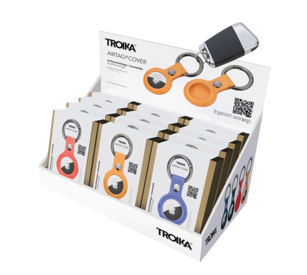 Thekendisplay inkl. 12 x AIRTAG COVER-Schlüsselanhänger, vorsortiert (je 2 x KR21-20/BK, KR21-20/DB, KR21-20/RD, KR21-20/YE, KR21-20/PU, KR21-20/OR), zur Selbstbedienung, Pappe, bedruckt, matt, mehrfarbig
